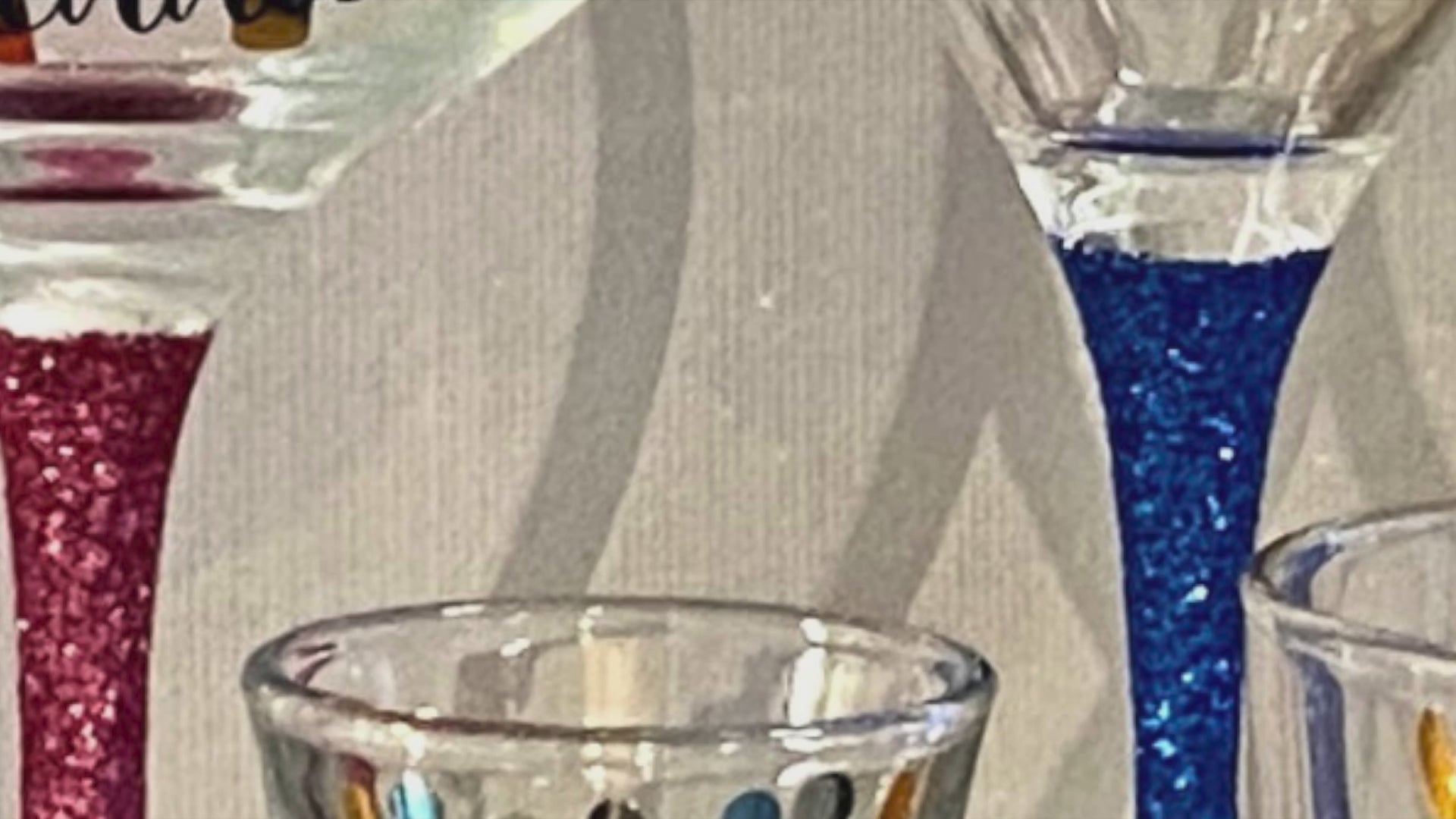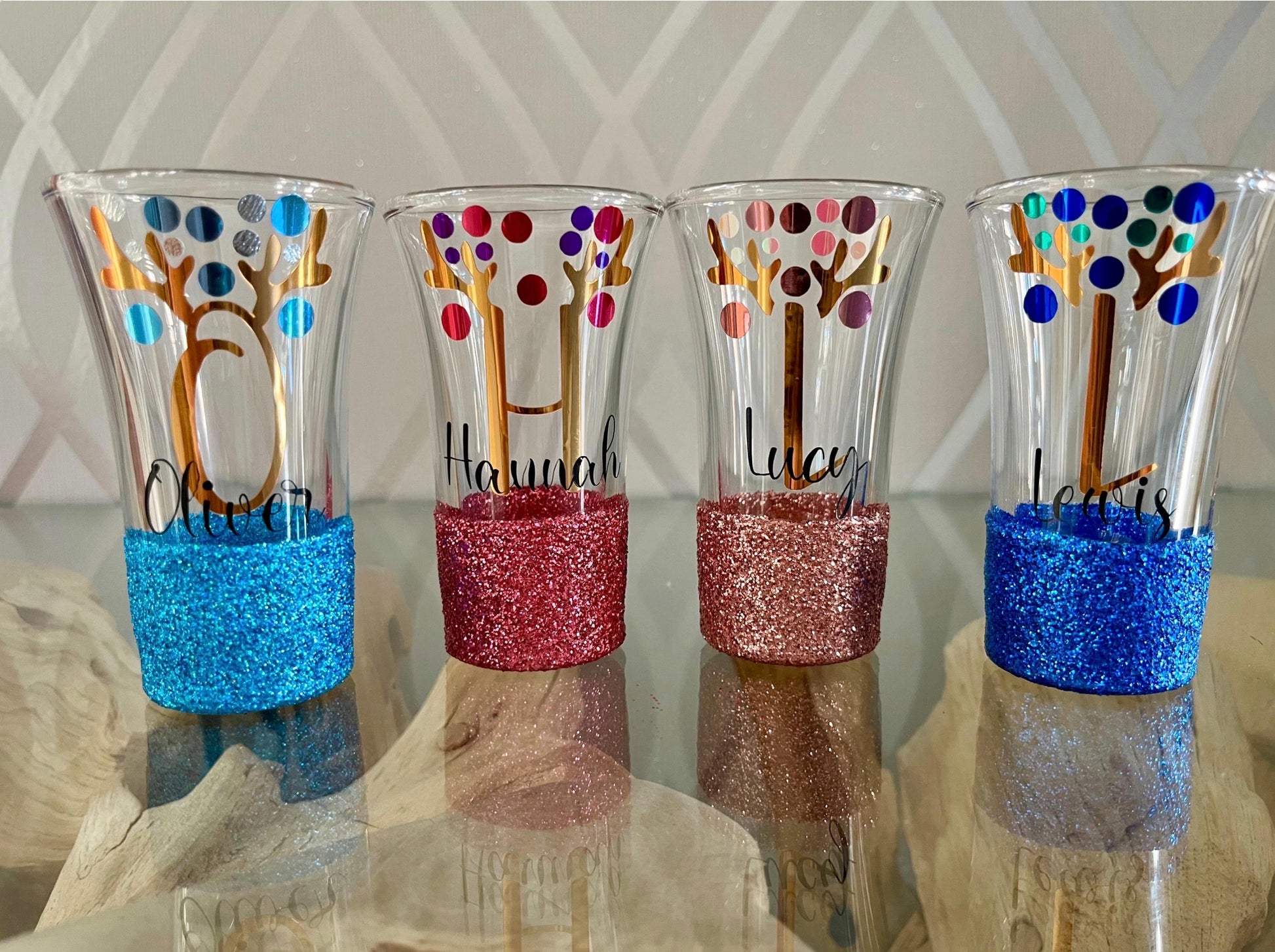 Just choose the style of glass, the colour combination of the your confetti, glitter colour and the recipients name.